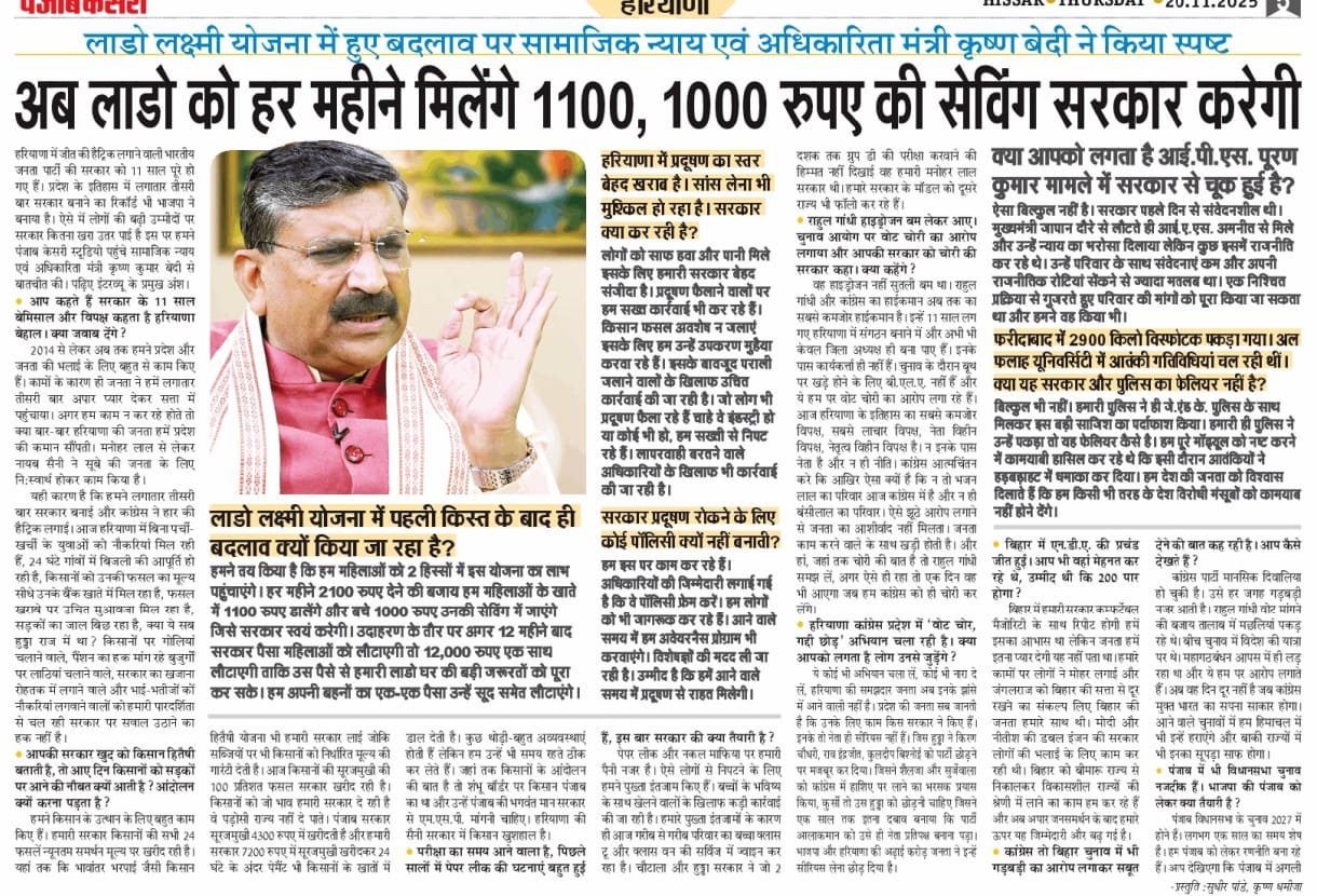 हरियाणा के माननीय मुख्यमंत्री नायाब सैनी द्वारा इस योजना की शुरुवात 25 सितंबर 2025 को गई थी, जिसकी पहली किस्त October महीने मे महिला लाभार्थीयो के खाते मे डालदी गई थी, लकिन सरकार द्वारा इस योजना के तहत बहुत बड़ा बदलाव किया गया है जिसके अनुसार अब महिलाओ को 2100 रुपये की जगह 1100 रुपये दिए जाएगे जिसका सामाजिक न्याय एंव अधिकारिता मंत्री कृष्ण कुमार बेदी जी ने निम्न कारण बताए है जिसमे से मुख्य कारण इस प्रकार है इंटरव्यू के दौरान कृष्ण कुमार बेदी जी ने बताया है की सरकार ने योजना के भुगतान के ढांचे मे बदलाव का निर्णय लिया है, मंत्री जी ने कहा है की महिलाओ को सीधे 2100 रुपये ना देकर 1100 रुपये हर महिना दिए जाए, जबकि बचे हुए 1000 रुपये सरकार द्वारा लाभार्थी के सेविंग खाते मे जमा किए जाएगे।